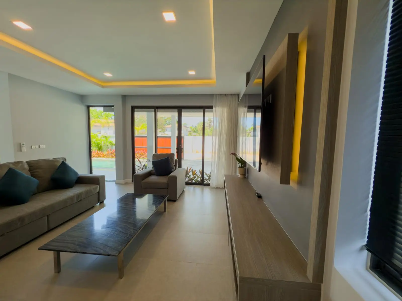 - Marble coffee table, rugs, built-in TV cabinetry, blinds, and curtains